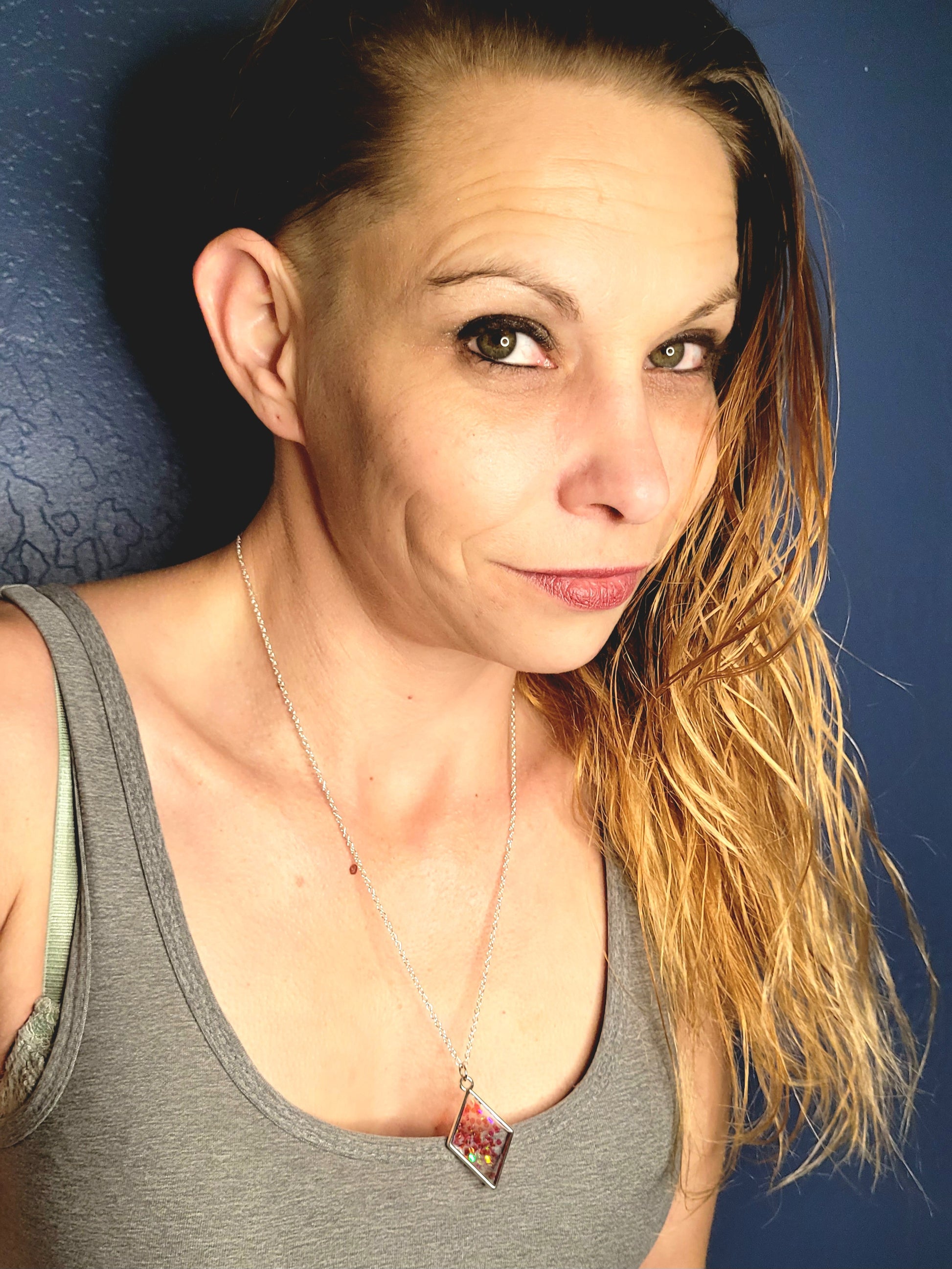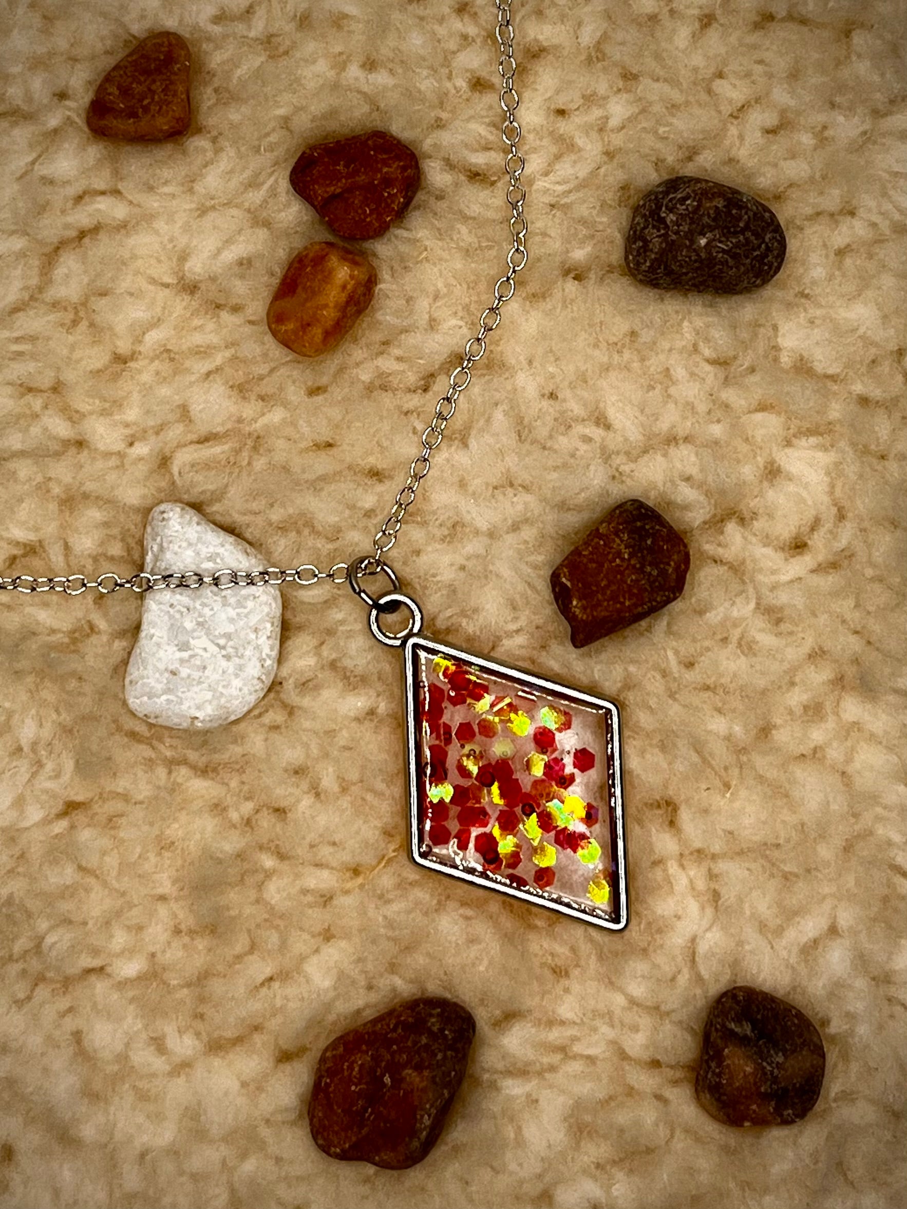 Experience the beauty of glitter-infused resin jewelry with this stunning diamond-shaped pendant necklace on a sterling silver chain. Handmade with love, designed to shine!