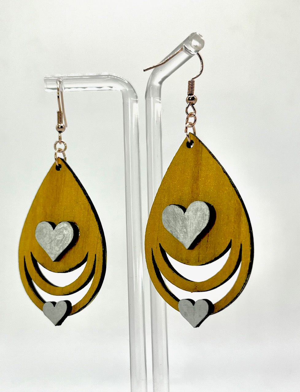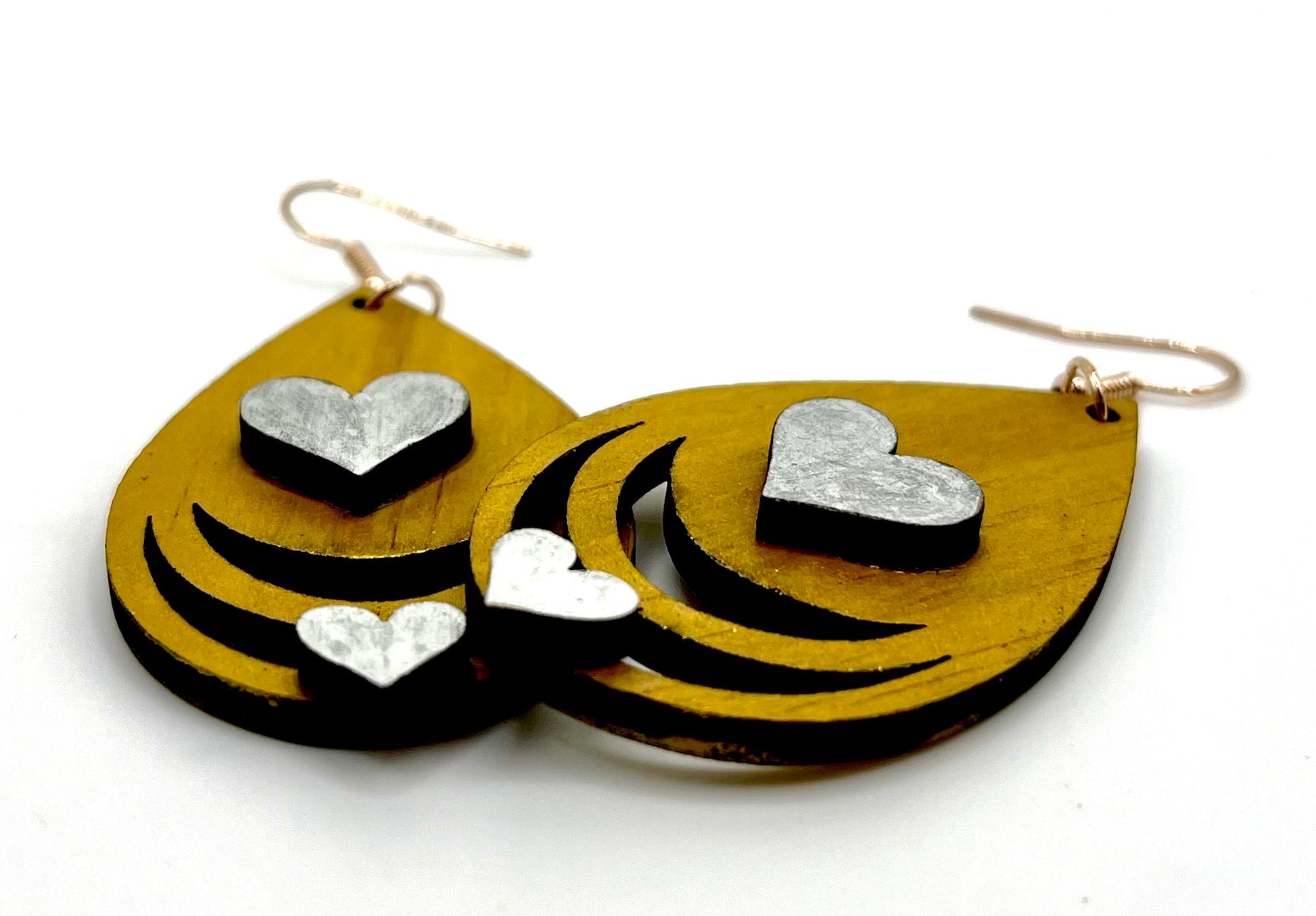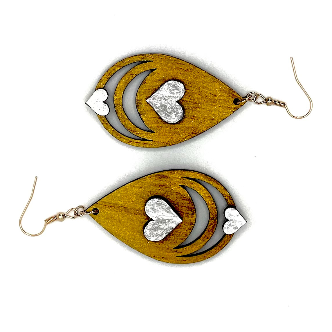 Whether you're dressing up for a special occasion or adding a subtle pop of color to your everyday look, these earrings are sure to make a statement. The gold paint finish and silver heart detail create a chic and versatile accessory that complements any style.