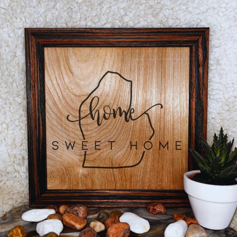 Handcrafted with care, this rustic framed laser-engraved wood wall hanging is a heartfelt tribute to the Wolverine State. Featuring the iconic state outline of Michigan surrounding the warm message “Home Sweet Home,” this wall décor offers a nostalgic nod to what really matters: where you feel most grounded.