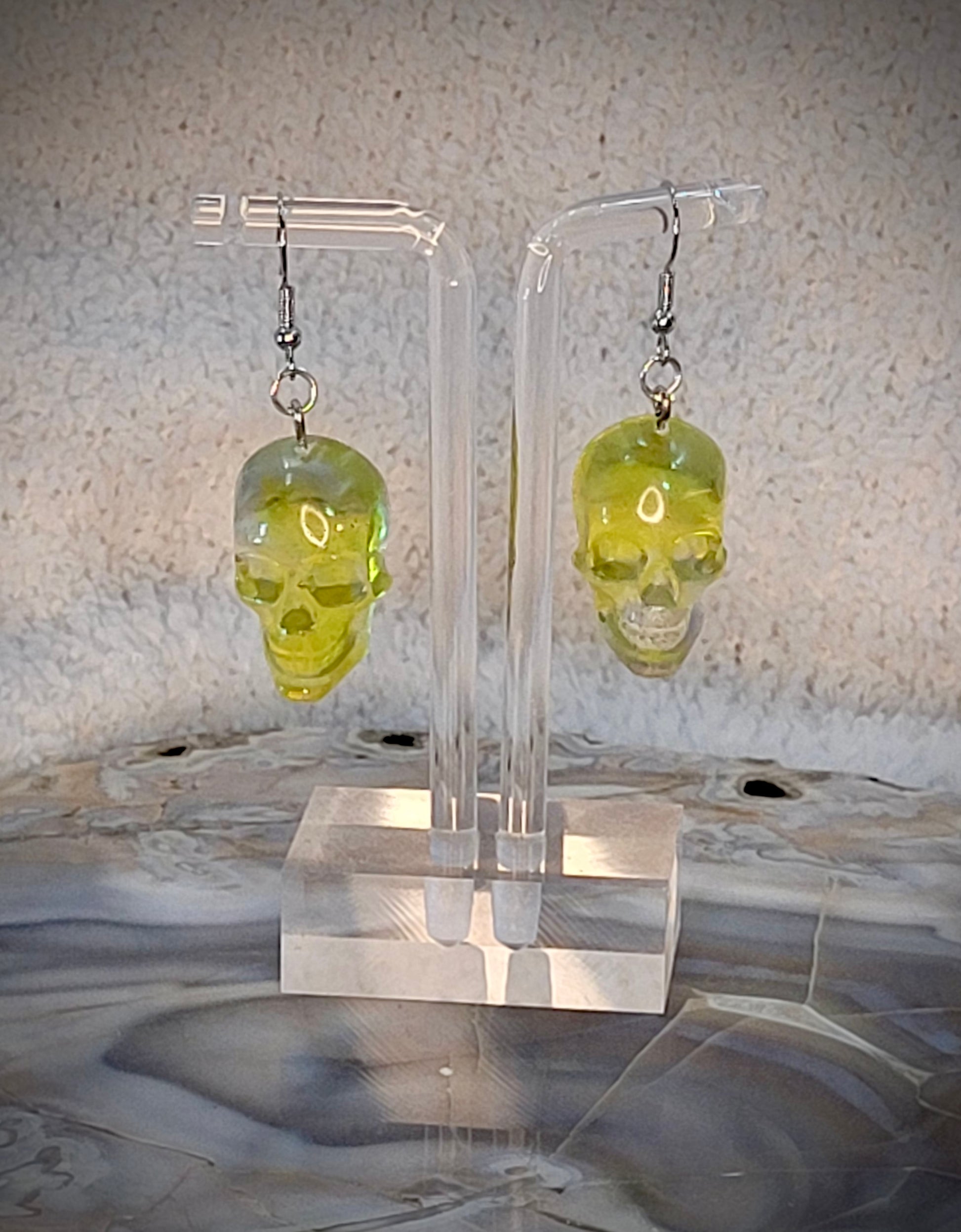 Pair them with your favorite outfits and let your personality shine with these stylish skull earrings. Whether you prefer the warm glow of the yellow-tinted variant or the timeless appeal of clear resin, these earrings are sure to become your new favorite accessory.
